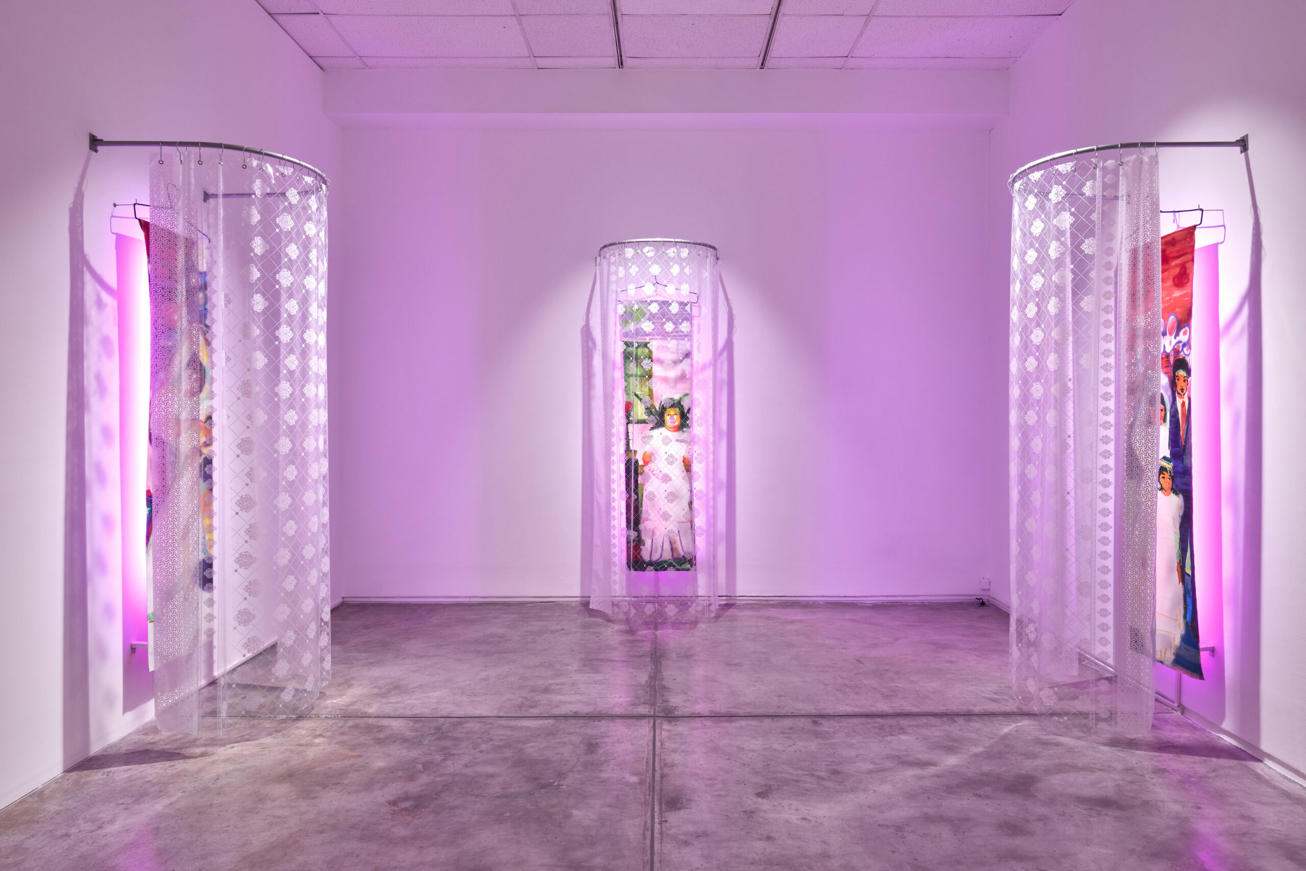 La artista, más que hablarnos de los “dobles” del amor nos habla de sus dobleces, sus grietas, esas que nos llevan a preguntemos si eso que vivimos es, realmente, el amor. Pero el campo del amor va más allá de los vínculos erótico-románticos, pues nuestras primeras experiencias afectivas se dan en el seno familiar. Y es precisamente dentro de la familia, cualquiera sea la forma que adopte, que (mal)aprendemos a querer. Nuestros modelos de pareja toman como pauta a nuestros padres, madres, tutores, aquellas personas que se ocupan de criarnos, malcriarnos y también criarnos mal. Fabiola apela a esa memoria recurriendo al archivo fotográfico familiar, recreando escenas de tradiciones domésticas y rituales festivos—siempre atravesados por relaciones de poder—.