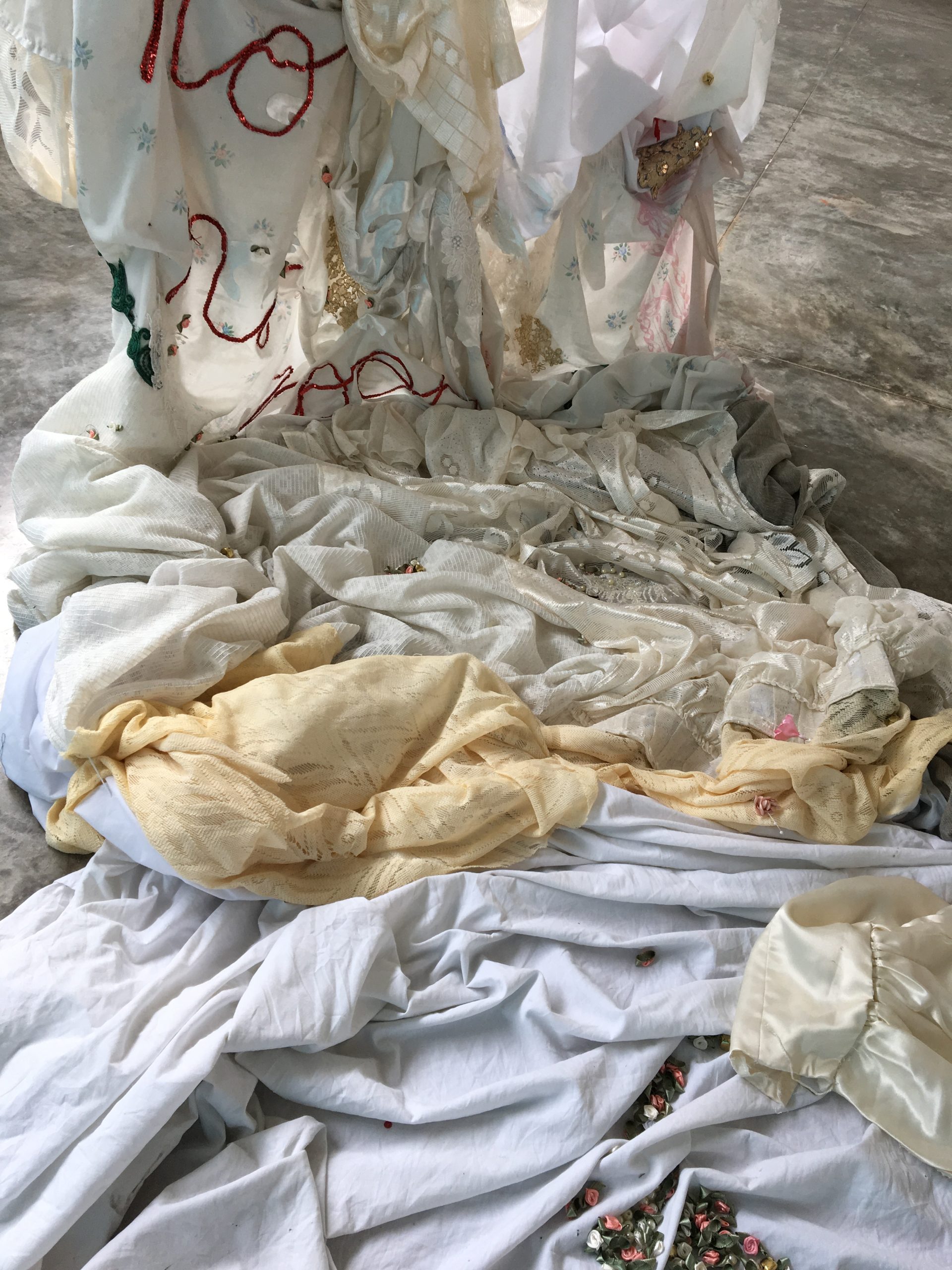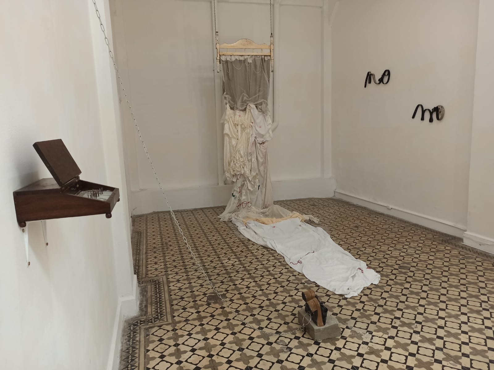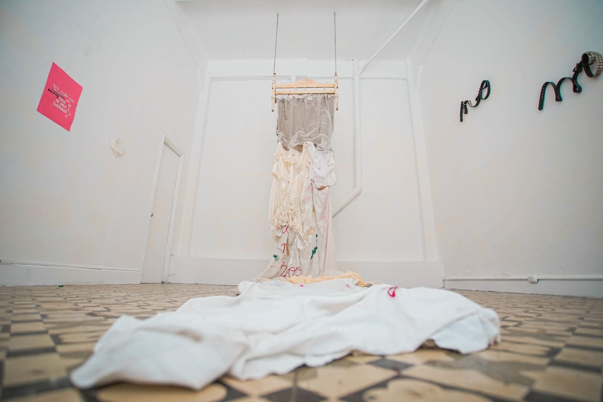 Pieza instalativa construida a partir de sábanas, manteles, vestidos de novia, cortinas de casa, artículos que continuamente están revistiendo objetos, cuerpos en espacios domésticos. La pieza ‘Estoy demasiada segura que es un no’ confirma la negación en la cual la violencia doméstica se disfraza por el mito del amor romántico y los archivos domésticos serán los testigos de los episodios de agresión pasiva y simultánea. Los elementos utilizados cumplen con vestir, ocultar, abrigar y pertenecer al diseño del hogar. Entonces, este collage simula la tradición de la cola de novia, que significa riqueza y prosperidad, que mientras más larga sea la cola de novia habrá mayor  abundancia.